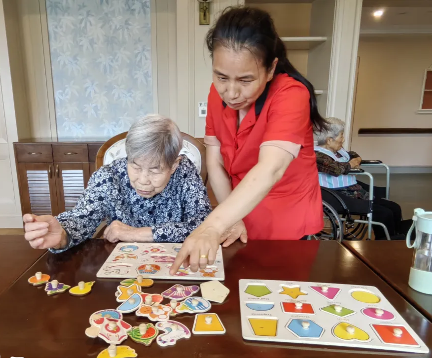 居家养老服务中心内,工作人员指导老人参与益智互动训练(西湖区融媒体中心供图)
