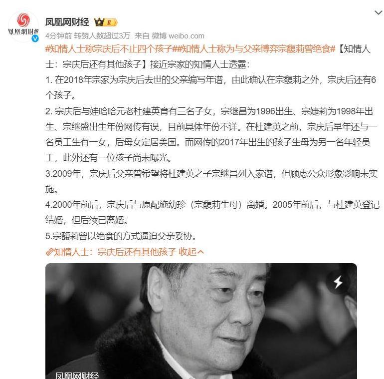 宗庆后生前一直以”爱妻宠女”的形象示人,外界普遍认为宗馥莉是他唯一的掌上明珠和事业继承人。然而现实往往比编剧笔下的豪门剧更加戏剧化。就在宗庆后离世后不久,先是爆出3名”私生子女”争夺遗产的消息,如今凤凰网通过采访多位知情人士,进一步披露了更为惊人的家族内幕。