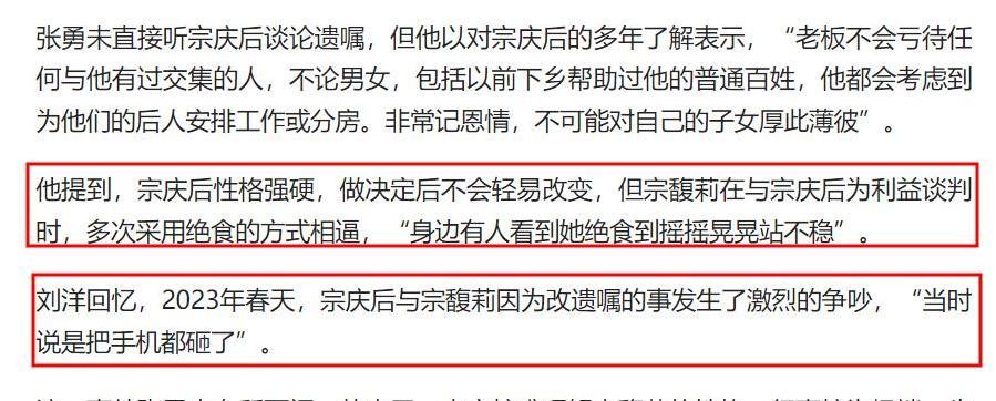 家族内部矛盾在2023年春天达到白热化。据称,宗庆后因修改遗嘱与宗馥莉爆发激烈冲突,甚至发展到摔手机的地步。可以想见,遗嘱修改内容必然涉及对其他子女的财产分配,而这正是宗馥莉无法接受的关键所在。