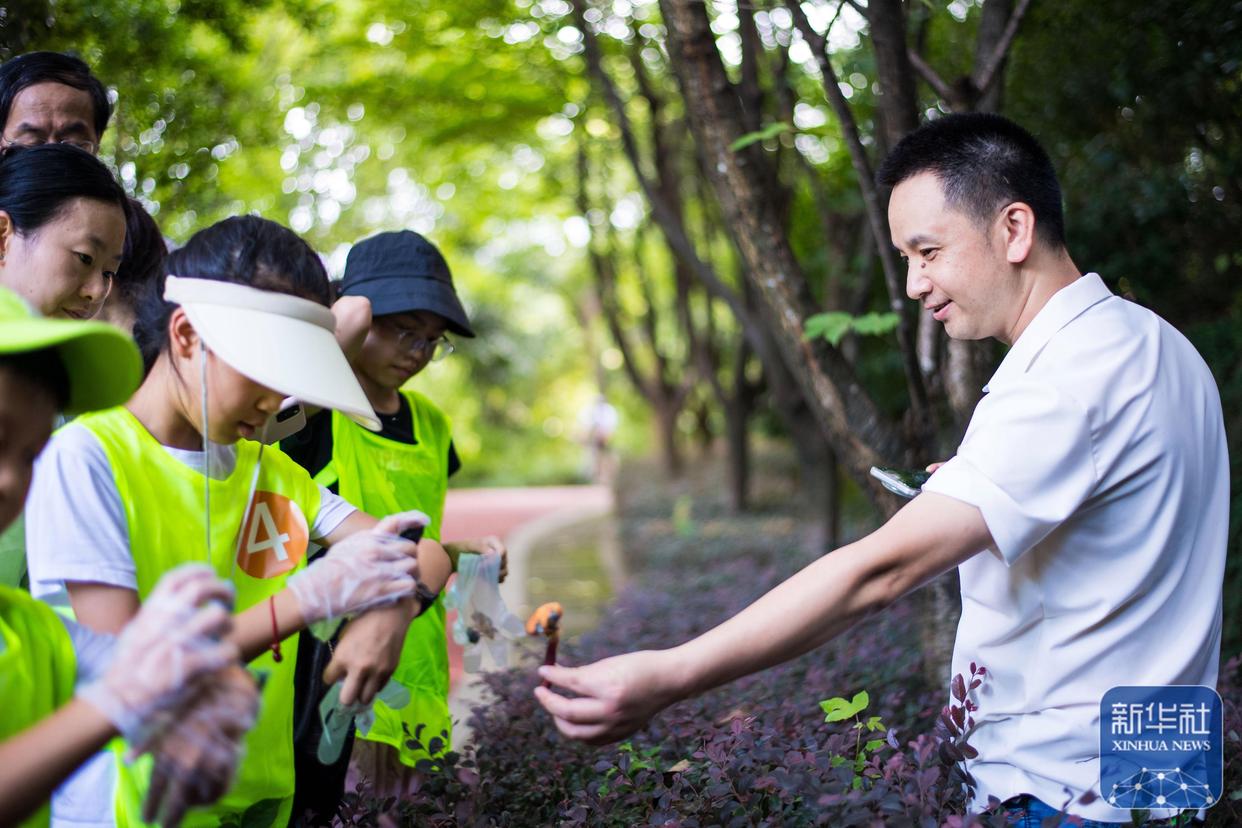 ↑ 7月19日,菌物科普导师周勇(右一)带领参加活动的孩子在杭州市上城区丁兰街道皋亭山上采集菌物。