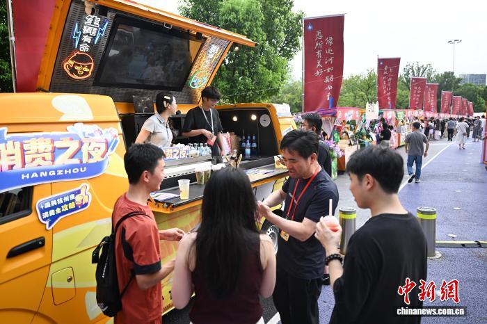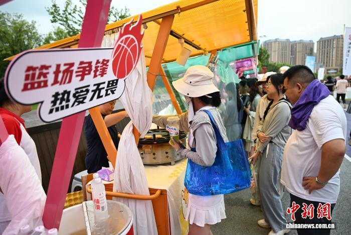 7月27日,市民进入"浙BA·运河潮"活力市集。近日,浙江省城市篮球联赛(浙BA)杭州赛区半决赛、决赛陆续举办,民众观赛热情高涨。当地借力篮球运动热,打造“票根经济”“特色市集”等,带动相关消费。中新社记者 王刚 摄
