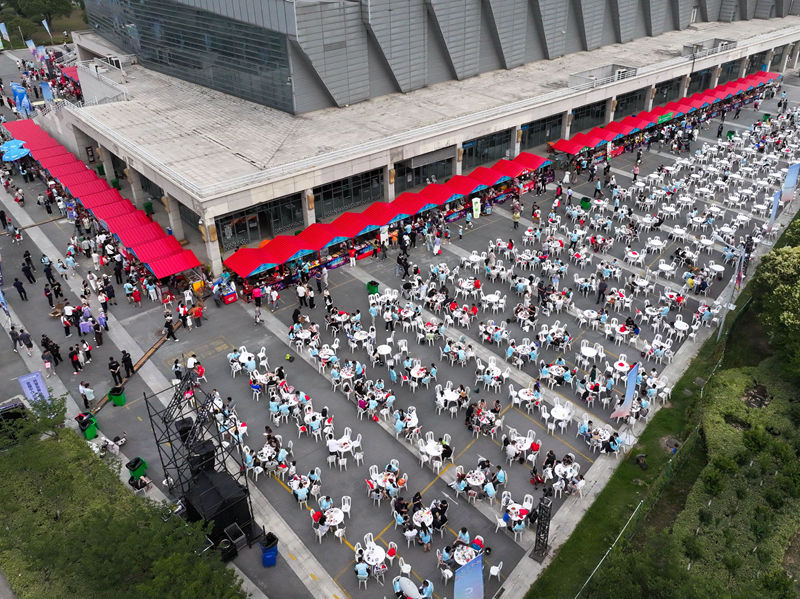 图为江苏淮安“苏超”市集(无人机照片)。新华社记者 李博 摄