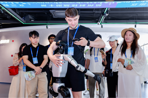 这一幕发生在8月5日,杭州科技旅游十景商务考察活动现场。此前,市文化广电旅游局推出“杭州科技旅游十景”。“十景”覆盖龙头名企、特色小镇、智慧街区等,包括人工智能、虚拟现实、低空经济、航天技术、机器人等领域。截至目前,已经吸引了超15万人次参访,深受市场青睐。当天,市文化广电旅游局组织旅行社、研学机构及国际游客等成为“国际考察团”,一起探访了“十景”中的多个科技地标。人机交互的温情瞬间中,一条“科技+文旅”融合的创新游线正在杭州徐徐展开。