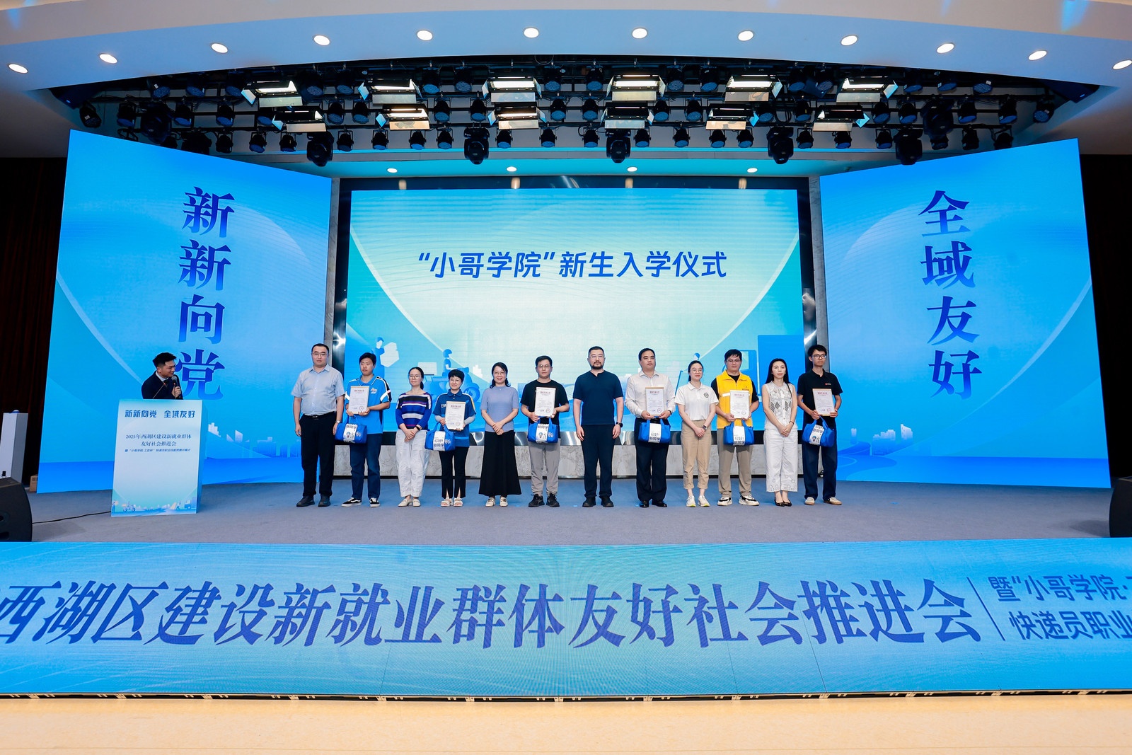 “小哥学院”是西湖区服务新就业群体的一大亮点。四年来,该学院累计招收学员157名,33人顺利毕业,6人实现岗位晋升。西湖区总工会为学员提供学费全免政策,今年还进一步扩大了覆盖范围和资助名额。现场,陆书霞等6名毕业生获颁浙江开放大学毕业证,6名新生代表接过录取通知书,并获赠由涵盖育英成长、权益护航、AI赋能等六大领域专家组成的西“新”导师团定制的“新生礼包”。