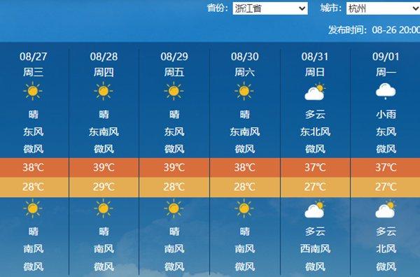 8月底前(8月27日至31日),浙江仍将十分闷热,杭州未来六天最高气温将持续超过37℃,或连续打破8月最长连续高温日数纪录。此外,明后两天浙江部分地区有分散性雷阵雨,或伴有8到10级雷雨大风,注意防范。