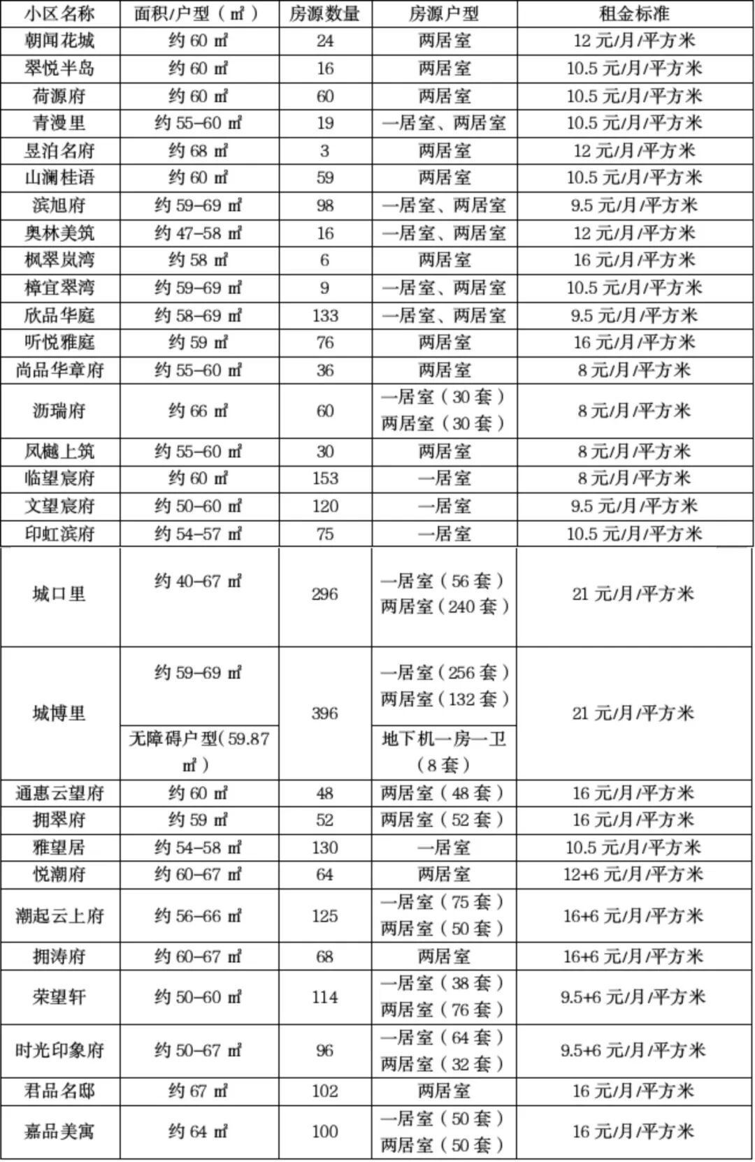 配租房源有2584套,主要位于萧山区朝闻花城、翠悦半岛、荷源府等多个小区,户型为成套一居室、两居室户型,户型面积、数量、租金标准等基本信息见下表: