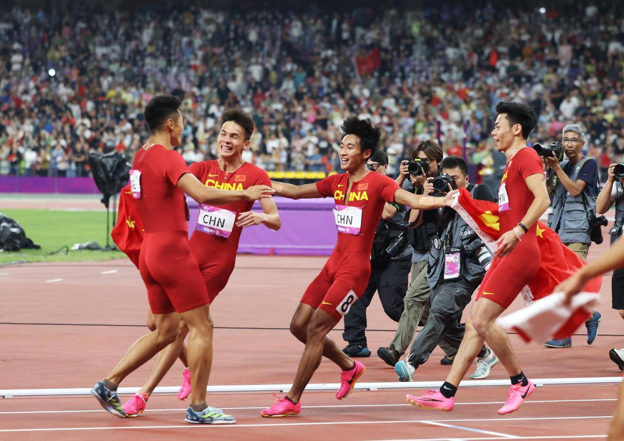 杭州亚运会男子4×100米接力夺冠瞬间。潮新闻资料图