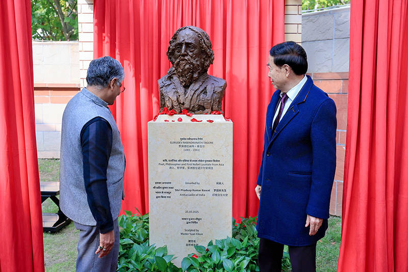 在全场嘉宾的见证下,袁熙坤与罗国栋大使共同为雕塑揭幕。这座青铜塑像不仅成为印度驻华使馆的新人文景观,更化作一座浓缩的“文明桥梁”,承载着两国人民对和平的向往与对友谊的珍视,为推动中印关系健康稳定发展注入文化力量 。