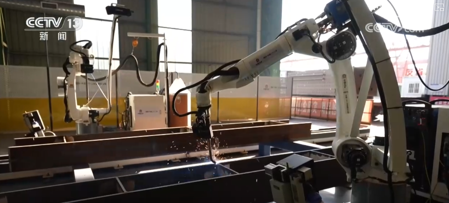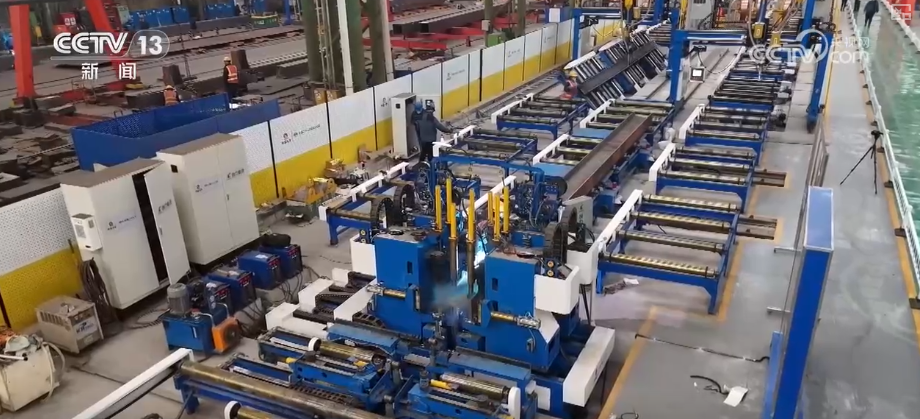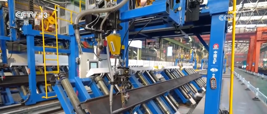 中国二十二冶集团金结分公司研究院副院长刘泽鲲介绍,前面的激光定位可以精确识别到焊缝的位置,可以进行自动纠偏和校核。生产效率提高了三到五倍,整个产线只需要8个人就可以。
