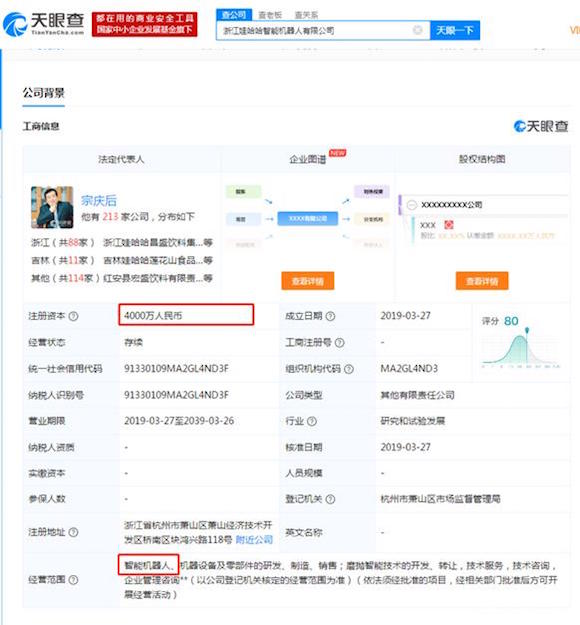 4月1日,天眼查工商资料显示,娃哈哈集团成立了浙江娃哈哈智能机器人有限公司。这家主营“智能机器人、机器设备及零部件的研发、制造、销售等”的新公司于2019年3月27日成立,注册资本4000万元,由娃哈哈控股投资。
